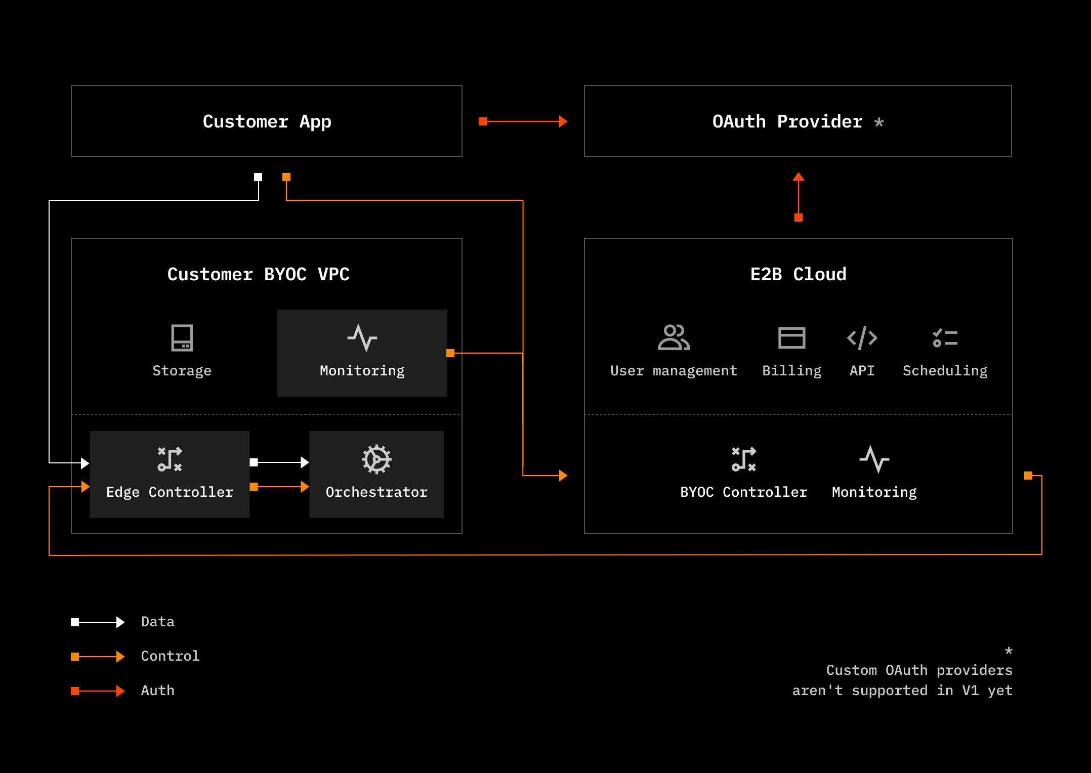 - OAuth Provider: Customer-managed service that provides user and E2B Cloud with access to the cluster.